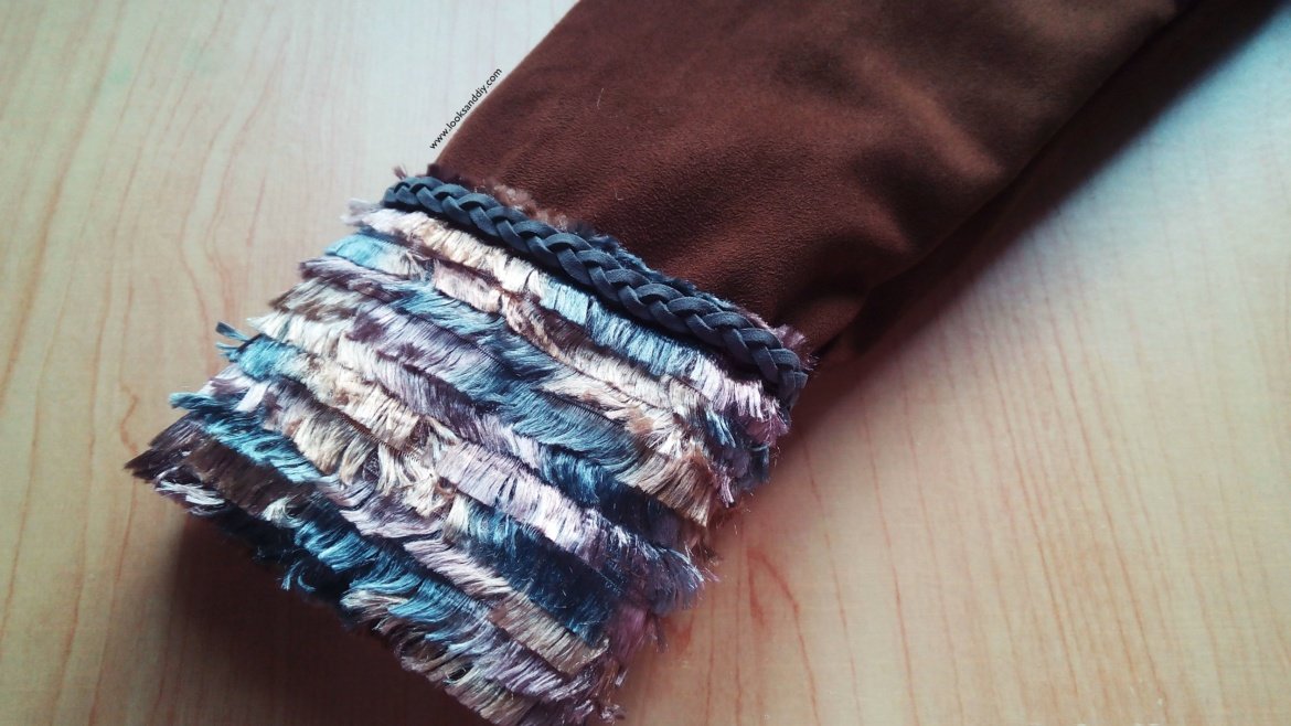 Para la parte superior utilicé una trenza que hice con la cinta de ante gris y por el reverso de la chaqueta la cosí a mano con una puntada invisible.